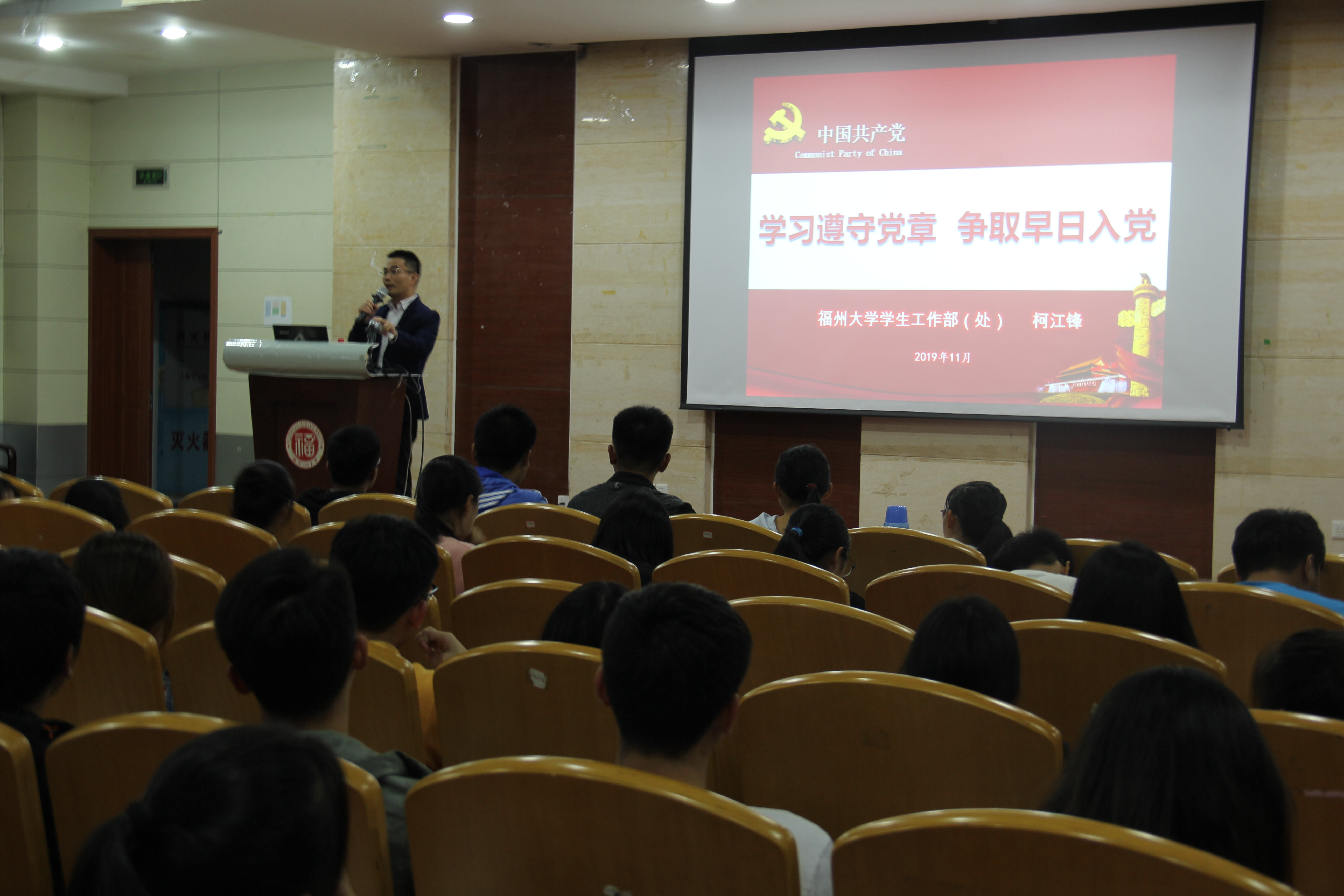 柯江锋老师以“学习遵守党章,争取早日入党”为主题,围绕着如何学习党章、党的性质、党的指导思想以及入党程序等部分向同学们传授知识。柯老师引用“孙武练兵”的故事,让同学们明白了制定党章的意义:“党章是党的根本大法,是全党必须遵循的总规矩,也是立党治党管党的总章程”。同时,柯老师希望同学们在党课学习期间积极参与互动,认真学习党章,做到知其然;联系实际学,深入思考学,做到知其所以然。