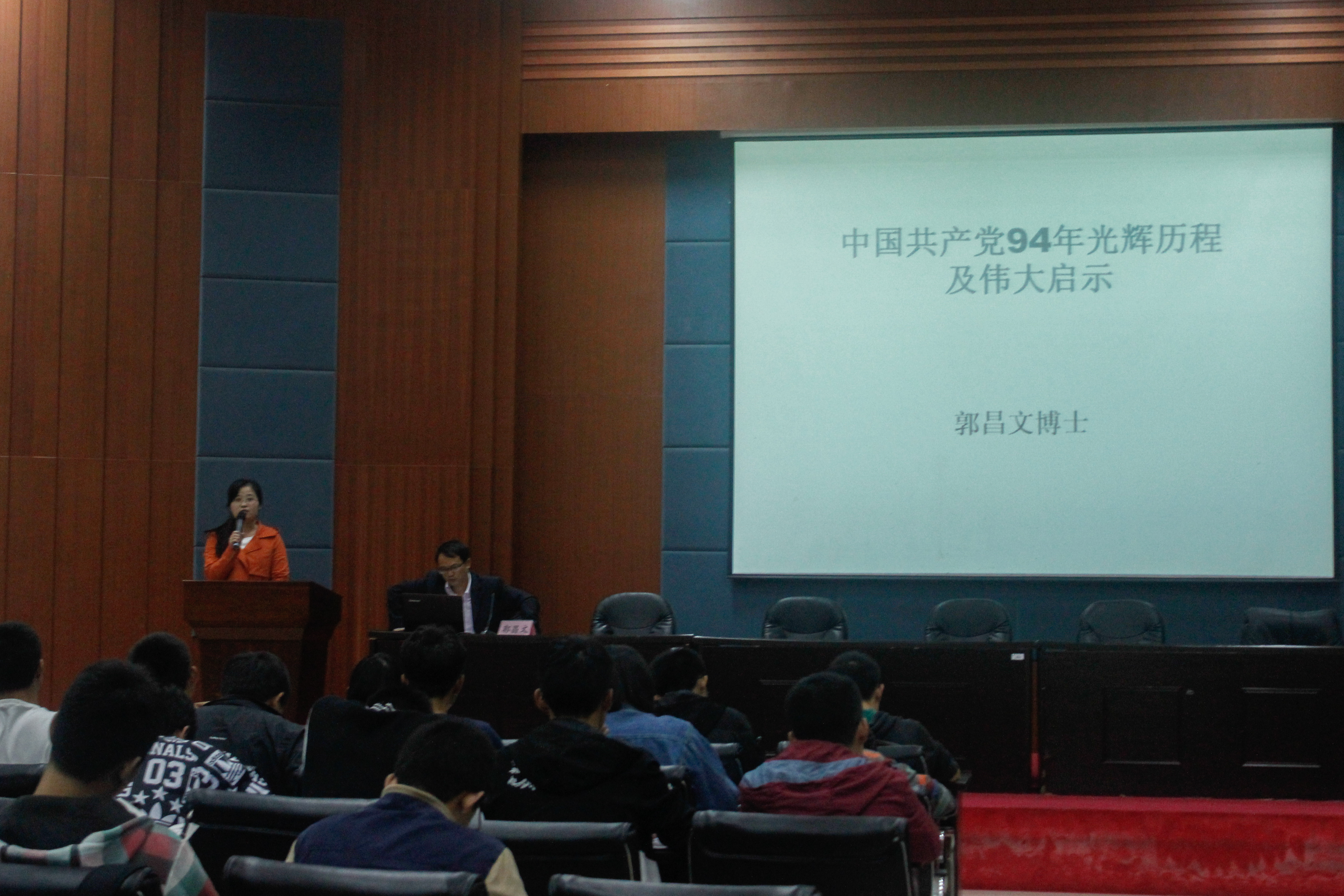 2015年11月12日晚,紫金矿业学院第九期入党积极分子培训班第二讲在学院三楼报告厅举行。此次讲座邀请了马克思主义学院郭昌文老师,报告的主题为《中国共产党94年光辉历程及伟大启示》。在整个讲座过程中,郭老师作为一名优秀的共产党员,结合中国共产党94年的发展历程与自身经历为学员上了深刻的一课,他分析了共产党取得完全胜利的必然趋势,使大家对于中国共产党有了更清晰的认识,让学员们深刻地认识到共产党的先进性,也感受到了作为一个共产党员肩负的历史使命。