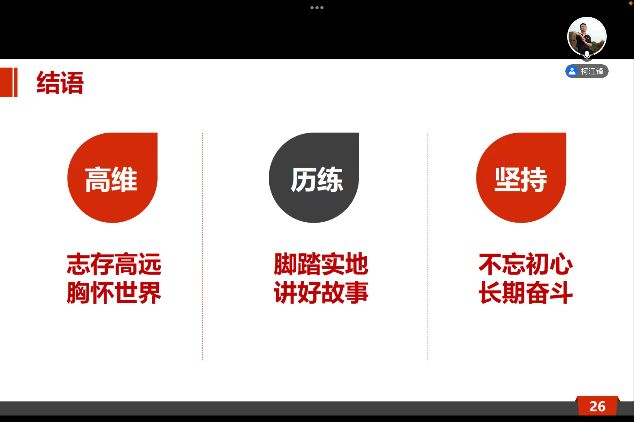 在党课的最后,柯老师对全体入党积极分子提出了诚恳的建议,希望同学们都能志存高远,经历历练后能够脚踏实地,不忘初心。柯老师最后以一句话寄语同学们:“党组织的大门是向每一个有志者敞开的,祝愿同学们早日跨入党组织的大门”。