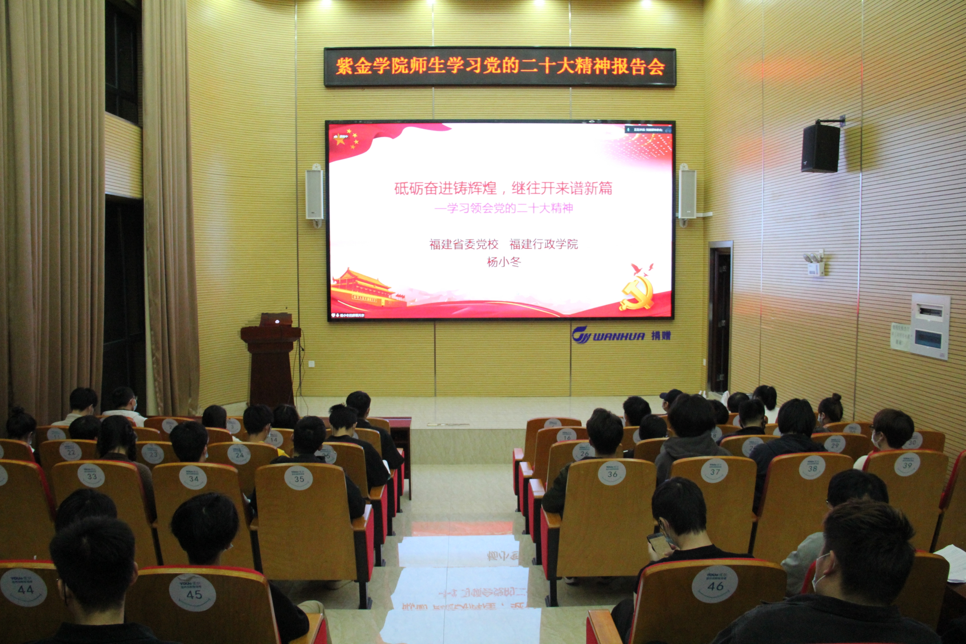 12月9日晚,成人论坛 师生学习党的二十大精神报告会第五讲在旗山校区泉港楼南101报告厅与铜盘校区同步举行,本次报告由福建省委党校、福建行政学院杨小冬教授作“砥砺奋进铸辉煌,继往开来谱新篇”主题报告,学习领会党的二十大精神。成人论坛 所有入党积极分子入团积极分子及师生党员参加本次报告会。