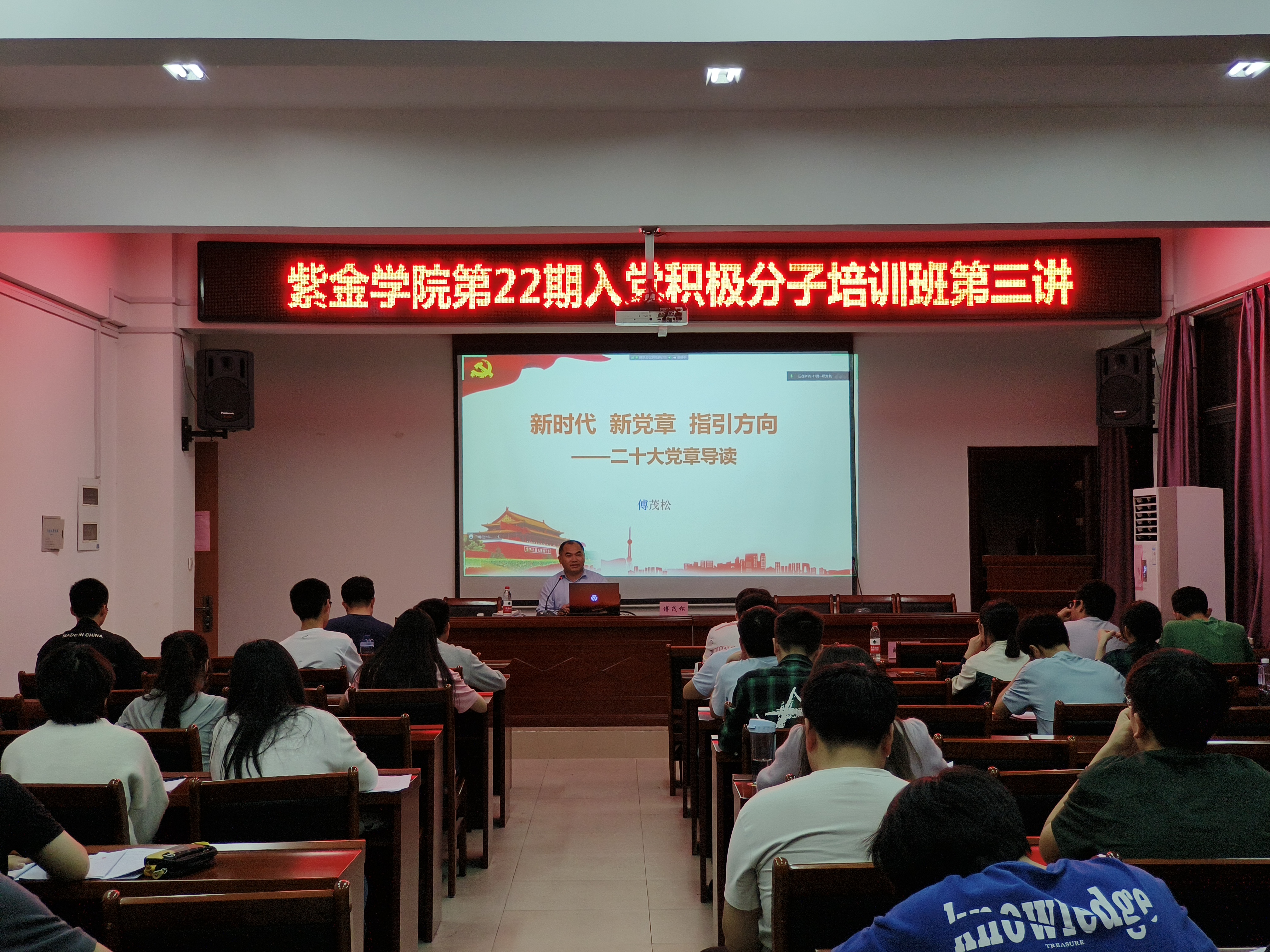 为让入党积极分子更加了解党章,4月20日晚,成人论坛 于紫金304会议室举办第22期入党积极分子培训第三讲,计算机与大数据学院党委副书记傅茂松研究员作题为《新时代 新党章 指引方向》报告,成人论坛 团委书记欧国庆老师和第22期入党积极分子参加本次培训。