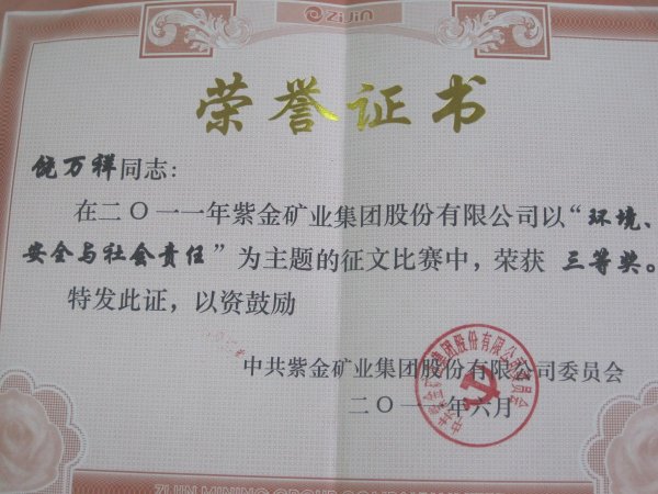 在2011年紫金矿业集团股份有限公司以“环境、安全与社会责任”为主题的征文比赛中,成人论坛 2008级资源勘查工程专业饶万祥同学的文章《抉择的力量---之腾飞的紫金》喜获三等奖。本次征文比赛整个集团公司共评出两个一等奖、五个二等奖及六个三等奖。