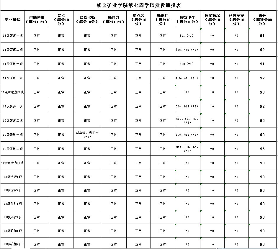 紫金矿业学院2013-2014学年第七周学风建设通报